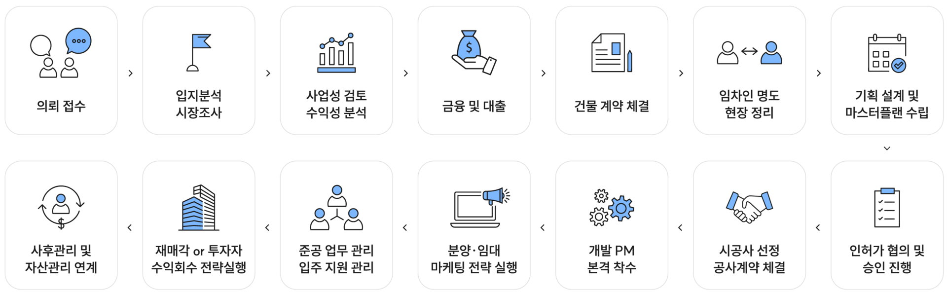준공 후 건물 관리 ㅣ 시장 노출 및 마케팅 ㅣ 계약 및 마무리 ㅣ 리스크 관리 ㅣ 사후 관리